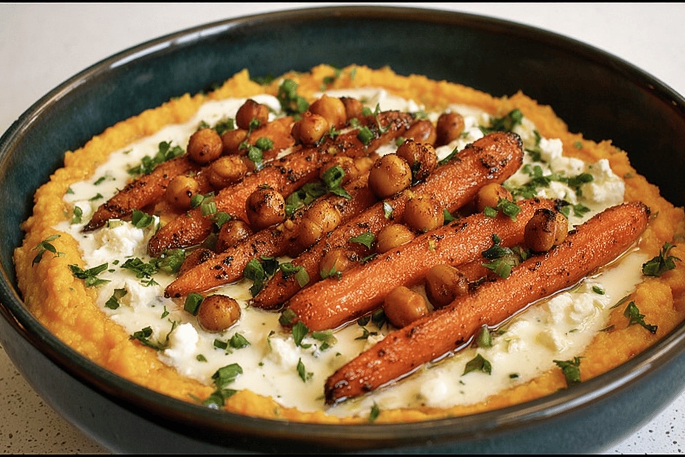 Cette recette de Carottes Pois Chiches & Crème de Feta est un plat savoureux et équilibré, parfait pour un repas sain et convivial