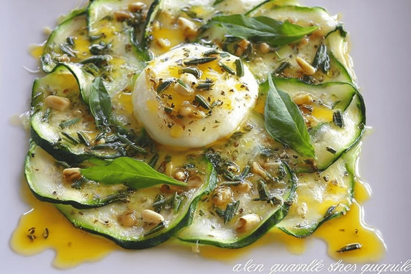 Ah, le carpaccio de courgettes avec chèvre chaud… C’est un peu ma petite fierté quand je veux faire simple mais qui en jette, tu vois ? Je me souviens la première fois, j’avais sorti toutes mes plaques, tenté de couper les courgettes hyper fin, et évidemment, une s’est échappée, rebelle, s’est retrouvée par terre. Mais au final, ce plat c’est un vrai coup de cœur, hyper frais, léger, et parfait quand t’as pas trois heures devant toi. Le mélange de la douceur des courgettes, avec ce chèvre qui fond juste ce qu’il faut, c’est comme un câlin dans l’assiette. Pas besoin d’être un chef étoilé, promis, tu vas même impressionner sans transpirer. Et en bonus, c’est healthy, rapide, et ça fait du bien après une journée un peu folle. Bref, prépare-toi, ce petit carpaccio est prêt à devenir ton allié des soirs où tu veux te régaler sans prise de tête. PrintCarpaccio de courgettes, chèvre chaud : Recette saine, rapide et 5 étoiles à essayer !