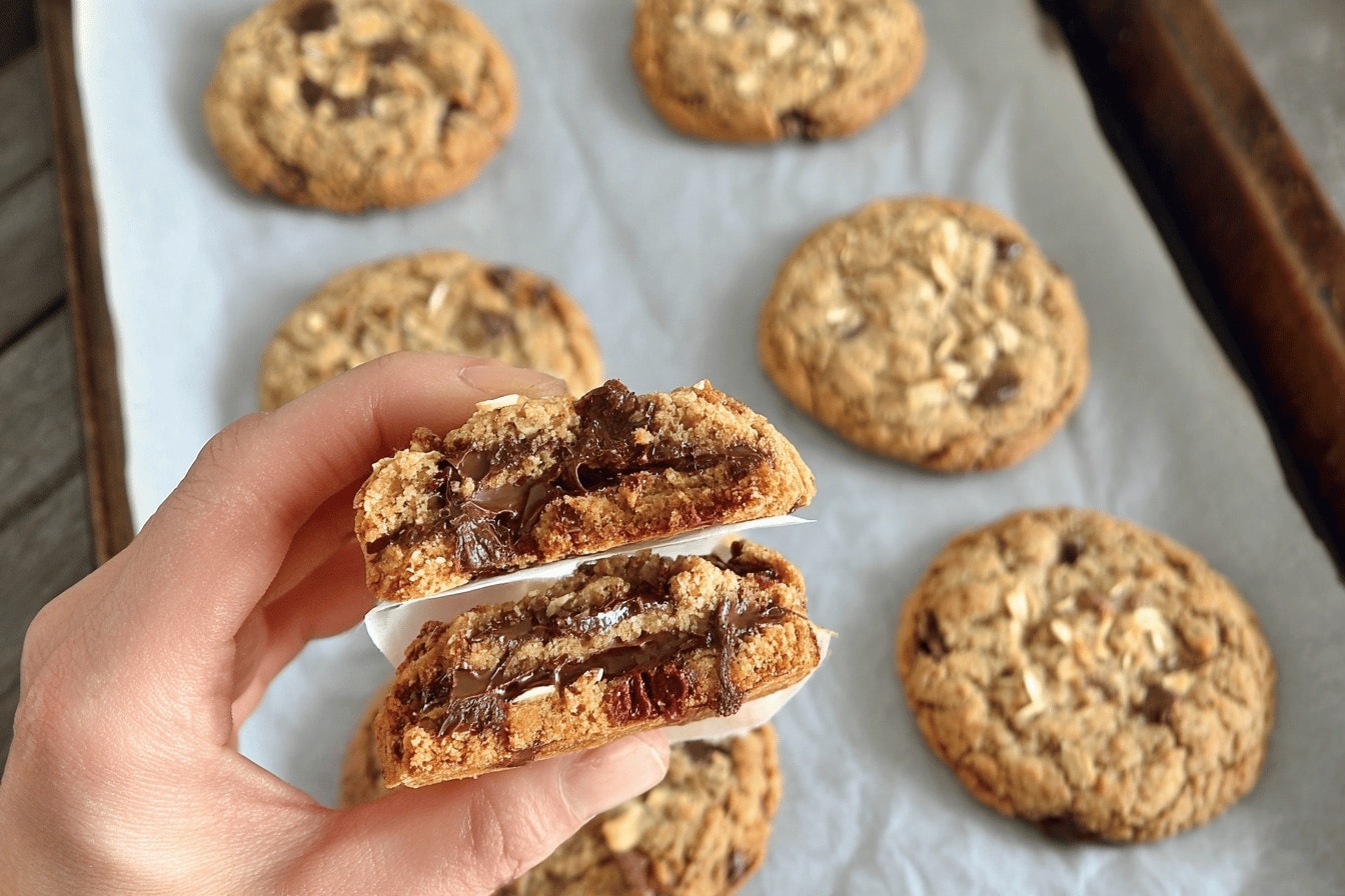 Pour changer un peu, remplacez les pépites de chocolat par des éclats de caramel et ajoutez des noix de pécan légèrement torréfiées. Un combo ultra gourmand et croustillant qui change tout.Cookies à la noix de coco et chocolat au lait