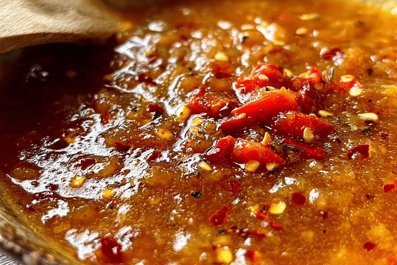 On commence par balancer tous les ingrédients solides et liquides dans un mixeur. C’est un peu comme une potion magique, sauf que là, ça pique et ça sent super bon. Si jamais votre mixeur galère un peu avec les piments, n’hésitez pas à mixer par petites pulsations, histoire de pas surchauffer la machine.Mijotage pour épaissir la sauce