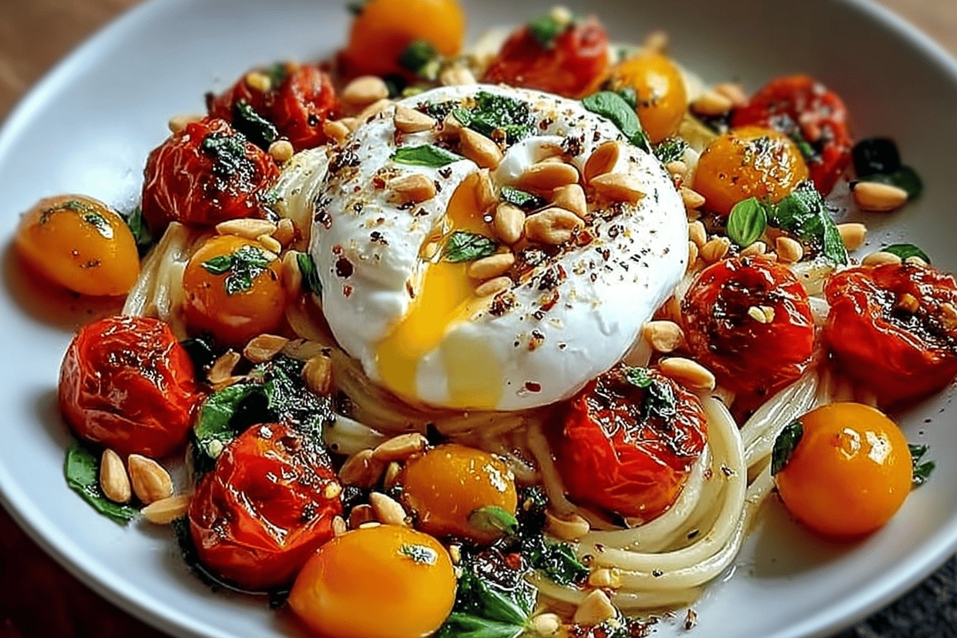 Voilà une recette qui sent bon l’été et la simplicité réconfortante. J’adore comment les tomates confites apportent cette douceur légèrement acidulée, tandis que la burrata fondante transforme vraiment le plat en une petite folie crémeuse. Et puis, ce piment d’Espelette, franchement, c’est la touche magique qui réveille tout sans jamais être trop fort. Souvent, je me surprends à la refaire plusieurs fois dans la semaine, même un soir de flemme totale. Le secret, c’est surtout de prendre le temps de bien confire les tomates, ça change tout, et puis on n’oublie pas ces pignons toastés qui craquent sous la dent, un vrai bonheur inattendu. Pas besoin d’être un chef pour se régaler, rassurez-vous ! Un plat simple, chaleureux, parfait pour un dîner entre potes ou une soirée solo avec votre série préférée.Suggestions d’autres recettes similaire ou d’accompagnement :