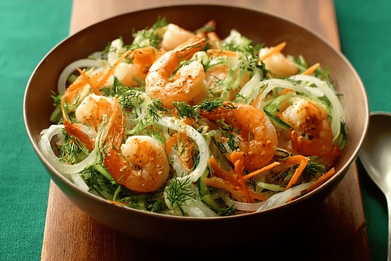 Cette salade de crevettes croquantes, aux légumes frais et aux herbes parfumées, est vraiment un petit bonheur à préparer, même quand la cuisine ressemble à un champ de bataille (oui, ce jour-là j’ai failli renverser la sauce de poisson partout, mais on ne juge pas). Ce mélange frais et acidulé, relevé juste comme il faut, fait toujours son petit effet à la maison. C’est le genre de plat qui donne envie de se poser, de ralentir un peu, et surtout, de profiter de chaque bouchée sous le soleil ou même un soir tranquille. Et puis, c’est rapide, léger, parfait quand j’ai envie d’un truc sain, sans prise de tête mais plein de saveurs. Franchement, j’adore servir ça à mes amis, ça déclenche souvent des « Oh, c’est super frais, c’est quoi ta recette ? ».Suggestions d’autres recettes similaire ou d’accompagnement :