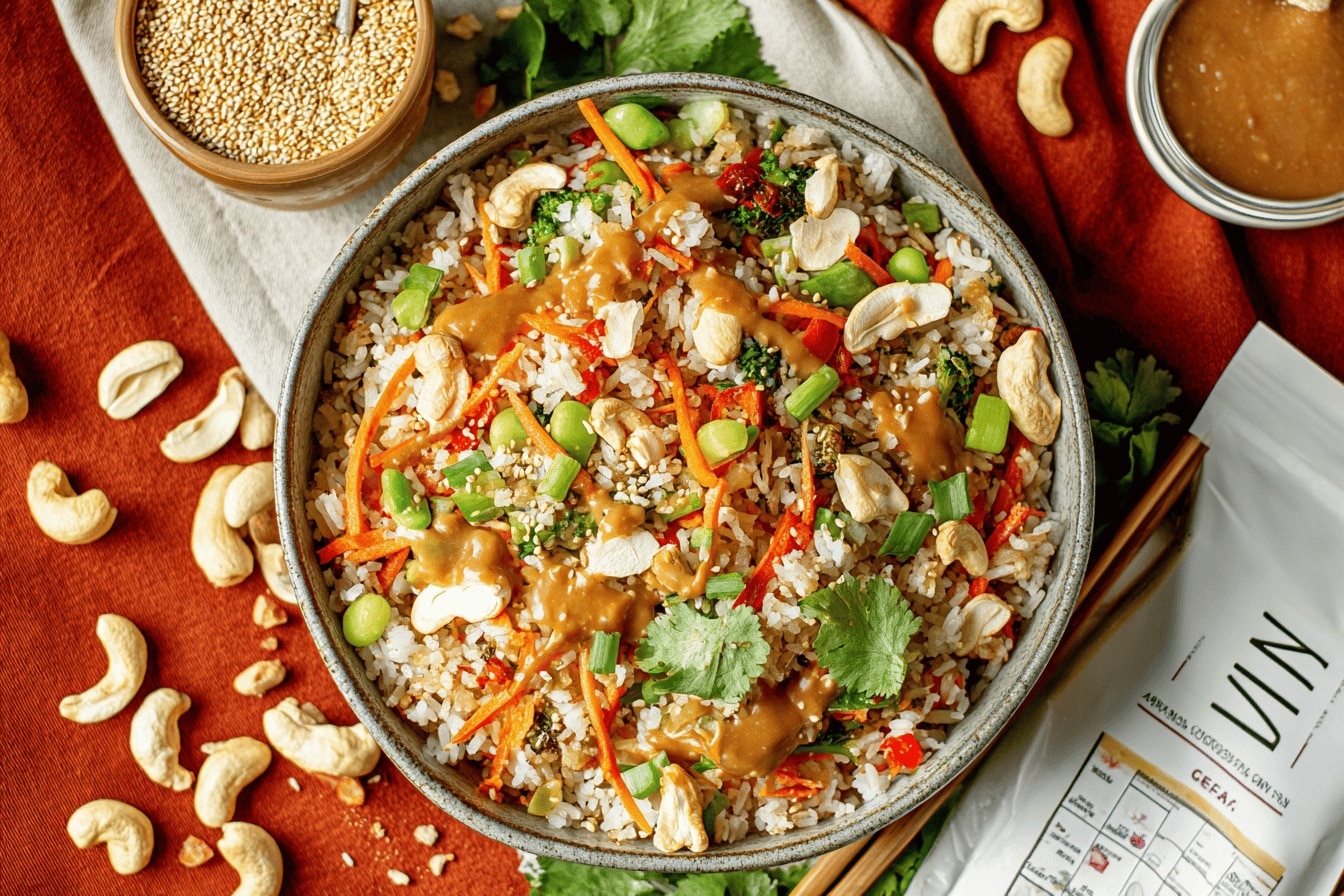Si t’as pas le temps de cuire ou juste pas envie, pas de souci ! Tu mélanges simplement le riz konjac rincé et égoutté avec tous les légumes, noix, graines et assaisonnements, puis tu ajoutes la sauce. Super frais, parfait pour un repas rapide.Petits conseils du bord