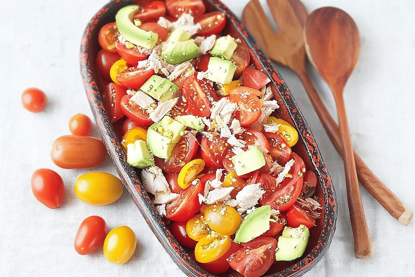Ah, la salade de tomates au thon et avocat, c’est un peu mon petit bonheur d’été, vous voyez ? Je me souviens d’une après-midi où j’étais un peu à la bourre, la cuisine en pagaille, les poches vides, et hop, ce mélange simple est venu à ma rescousse. Des tomates bien mûres, un avocat bien fondant, et ce thon tout prêt dans ma boîte qui traînait—rien que d’y penser, ça me met de bonne humeur. Ce n’est pas juste une salade, c’est ce genre de plat qui vous fait oublier le chaos autour, un vrai câlin dans une assiette. Parfois, je râpe un peu trop la tomate ou j’oublie un filet d’huile d’olive, mais ça fait partie du charme, non ? Cette recette est le genre de truc qu’on prépare sans prise de tête, parfait pour une pause déjeuner rapide ou un dîner léger entre amis. Allez, laissez-vous tenter par cette alliance toute simple, elle ne vous décevra pas ! PrintSalade de tomates au thon et avocat