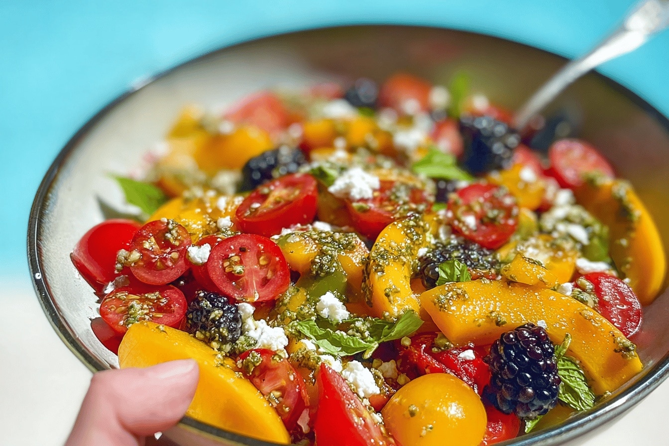 Salade de tomates et fruits d’été au pistou est une recette fraîche et colorée qui célèbre les saveurs estivales. Ce plat combine la douceur des fruits mûrs avec la fraîcheur des tomates, le tout relevé par un pistou parfumé. Léger et savoureux, il est idéal pour accompagner un repas d’été ou être dégusté en entrée lors des journées chaudes.